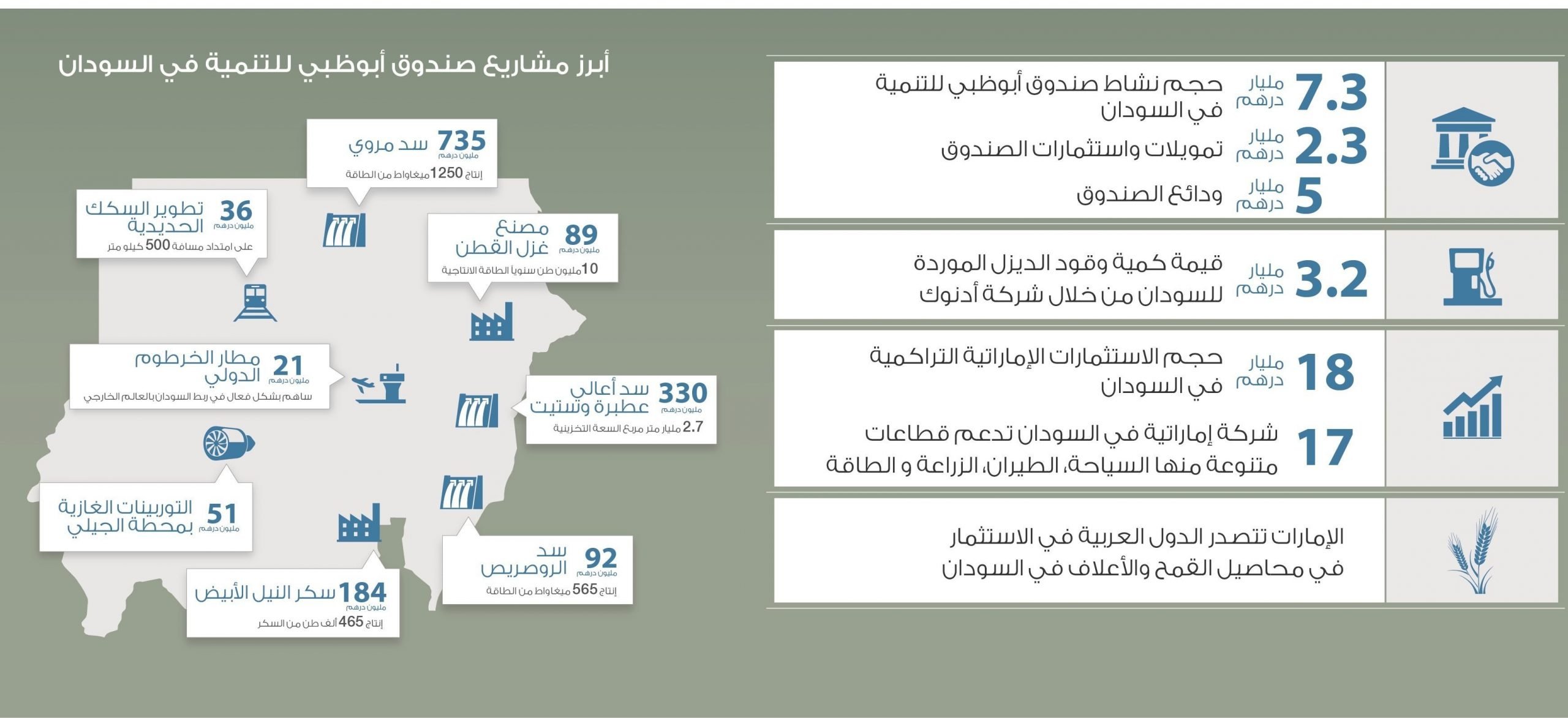 ودعم صندوق أبوظبي للتنمية، مشاريع متنوعة واستثمارات وودائع بقيمة إجمالية وصلت إلى نحو 7.3 مليارات درهم ومول الصندوق 17 مشروعاً تنموياً بقيمة بلغت حوالي ملياري درهم، تركزت على أكثر القطاعات حيوية وتأثيراً بما فيها الصناعة، والنقل والمواصلات، والطاقة، والمياه والري، وغيرها من المشاريع التنموية. كما قام الصندوق بدعم السيولة والاحتياطيات من العملات الأجنبية في بنك السودان المركزي من خلال إيداع نحو 5 مليارات درهم إماراتي ما يعادل( 1.4 مليار دولار)، وذلك لمساعدة الحكومة السودانية على النهوض بالاقتصاد وتجاوز التحديات المالية والاقتصادية، وتعزيز الاستقرار النقدي والمالي.