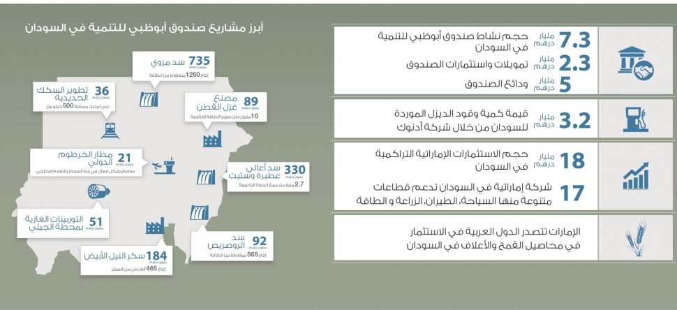 ودعم صندوق أبوظبي للتنمية، مشاريع متنوعة واستثمارات وودائع بقيمة إجمالية وصلت إلى نحو 7.3 مليارات درهم ومول الصندوق  17 مشروعاً تنموياً بقيمة بلغت حوالي ملياري درهم، تركزت على أكثر القطاعات حيوية وتأثيراً بما فيها الصناعة، والنقل والمواصلات، والطاقة، والمياه والري، وغيرها من المشاريع التنموية. كما قام الصندوق بدعم السيولة والاحتياطيات من العملات الأجنبية في بنك السودان المركزي من خلال إيداع نحو 5 مليارات درهم إماراتي ما يعادل( 1.4 مليار دولار)، وذلك لمساعدة الحكومة السودانية على النهوض بالاقتصاد وتجاوز التحديات المالية والاقتصادية، وتعزيز الاستقرار النقدي والمالي.